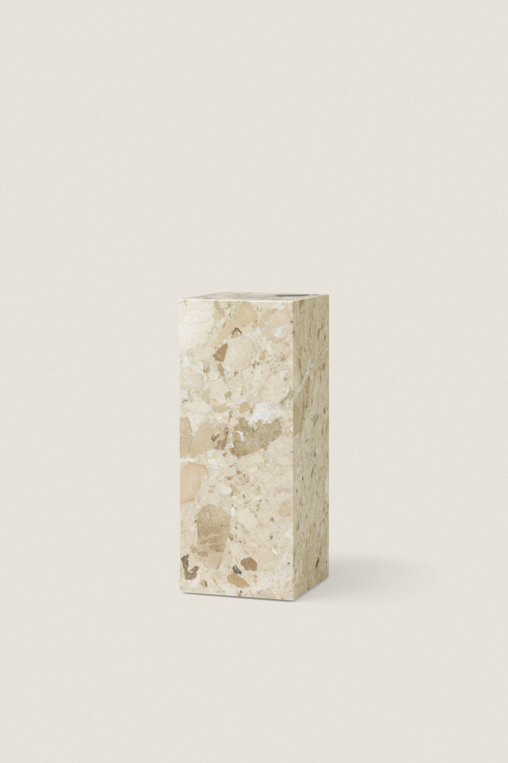 Kunis Breccia stone side table delivers an understated yet elegant presence due to its simple geometric shape and graceful stone texture.