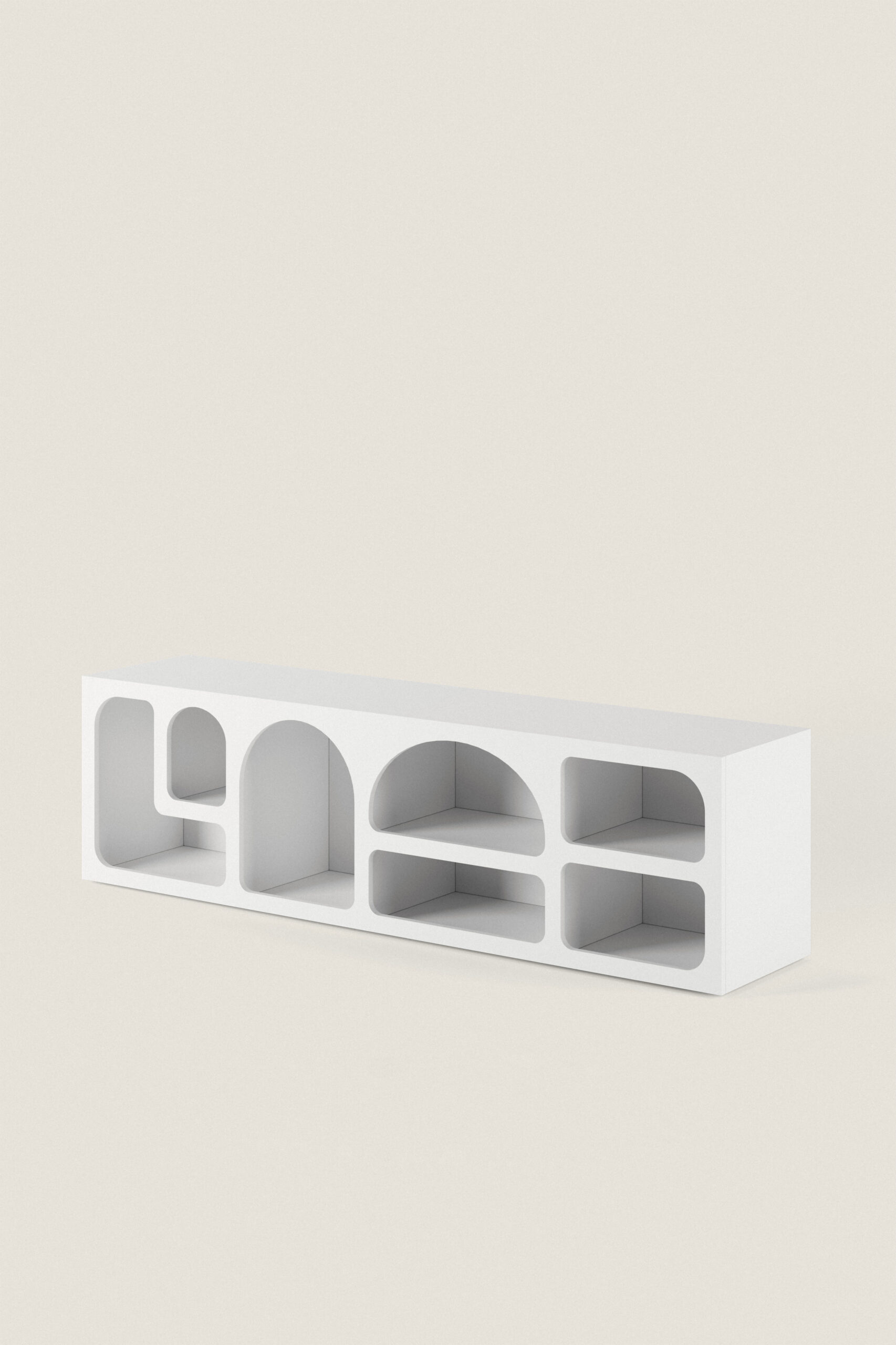 - Minimalist white TV unit with an asymmetrical design. It features a variety of open compartments with rounded and arched cutouts, creating a sculptural and artistic look.