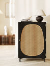 - Storage unit with six unique cut-outs in circular and oval shapes.