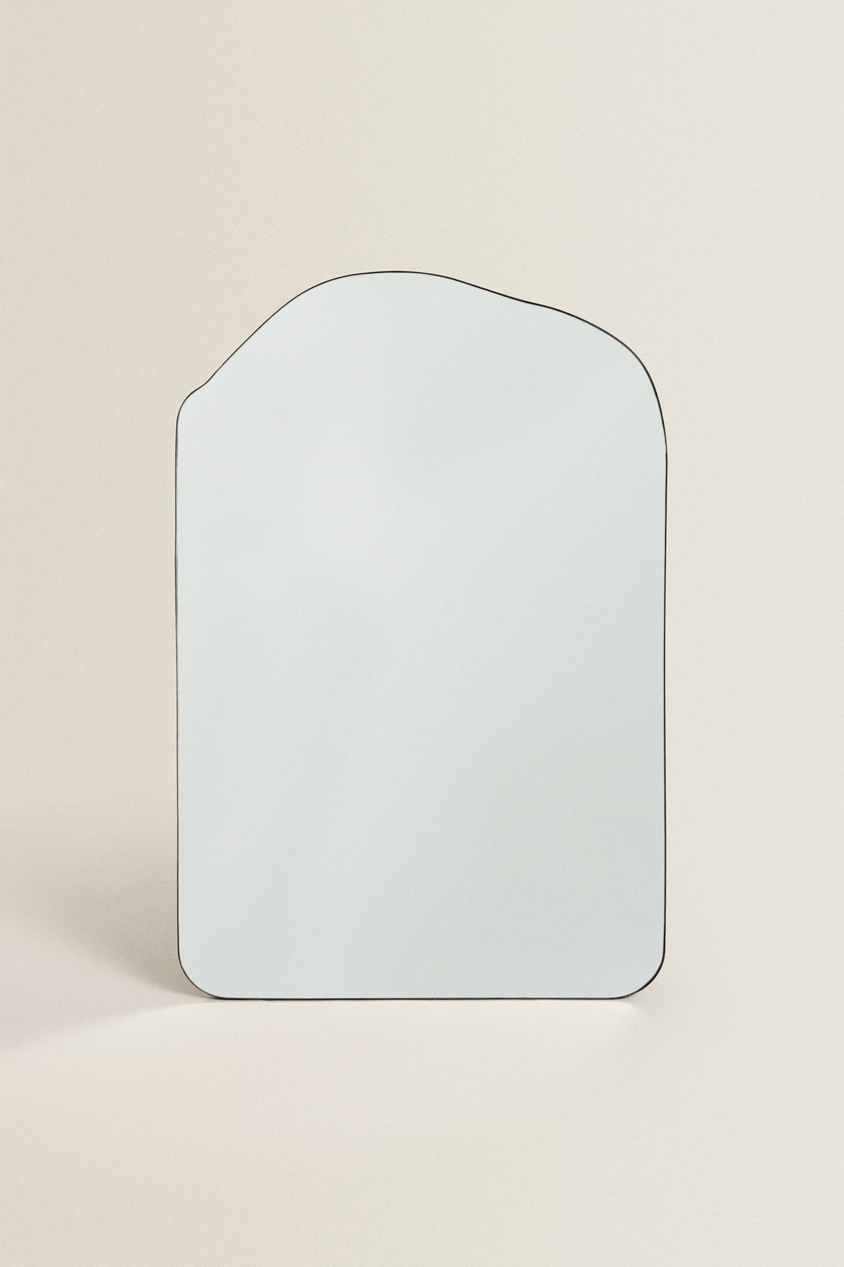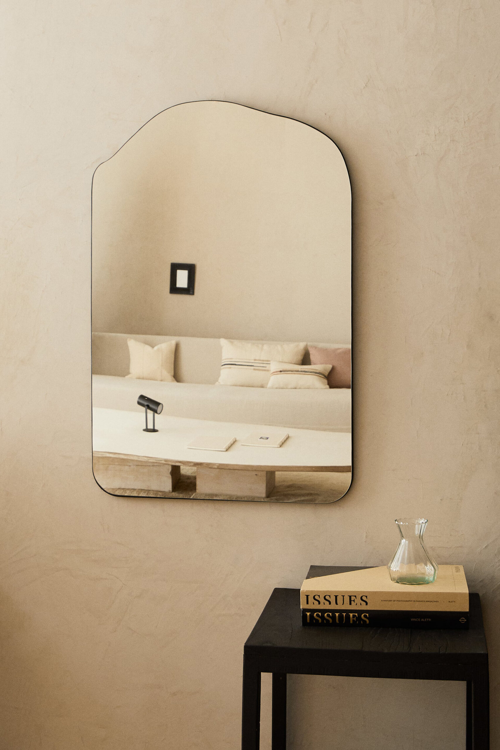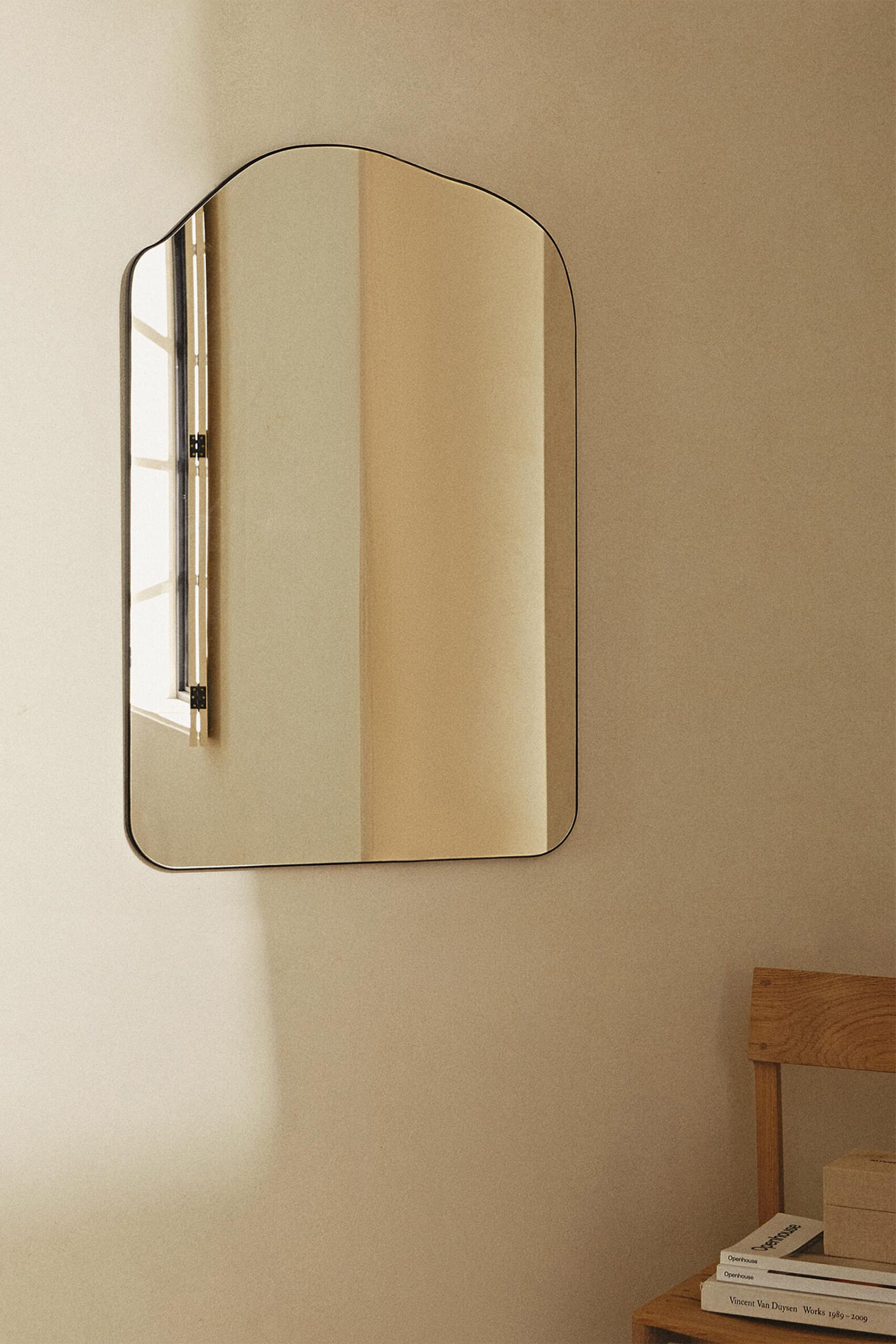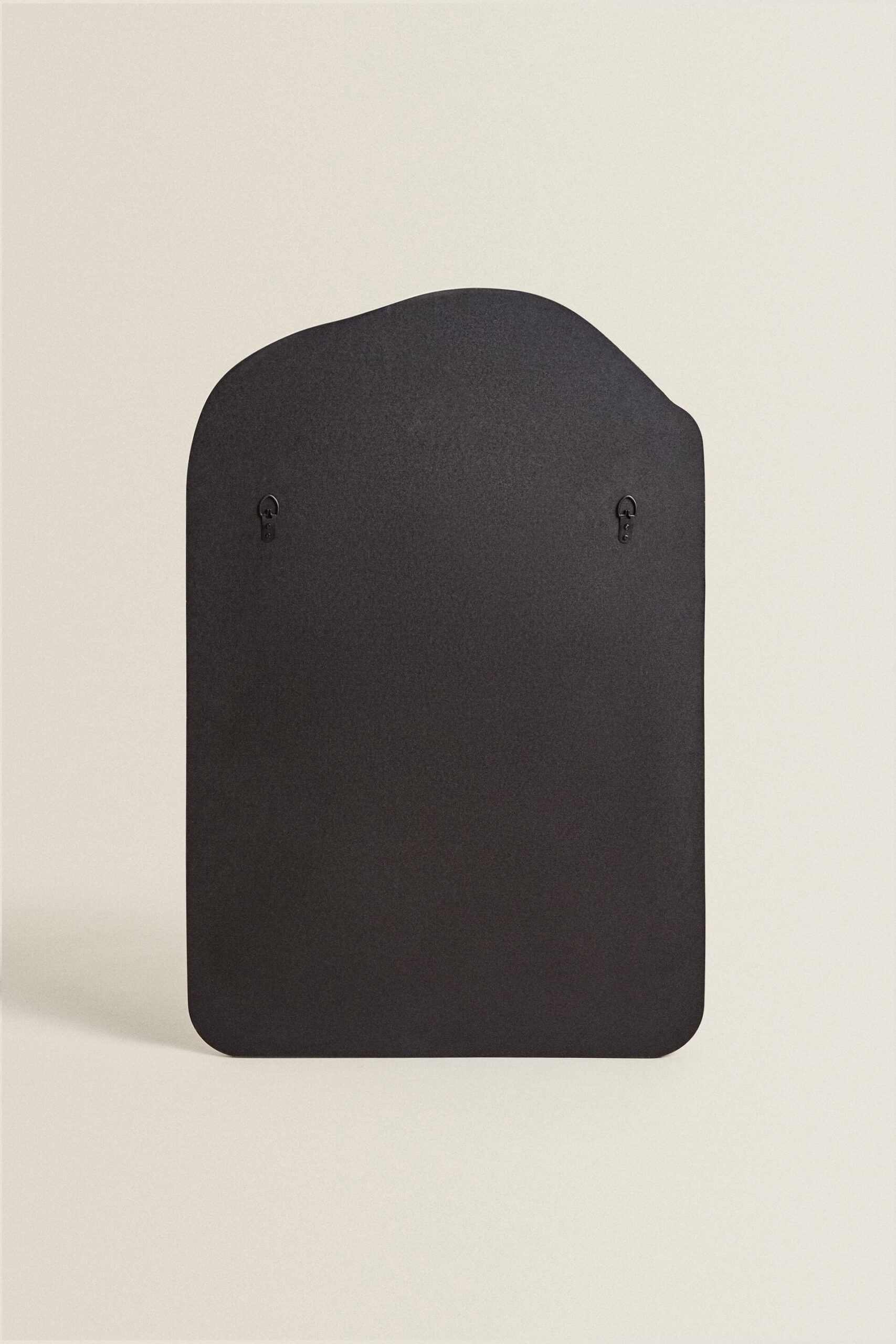 - An irregular-shaped wall mirror with a black frame with rounded edges has two anchor points for vertical placement.