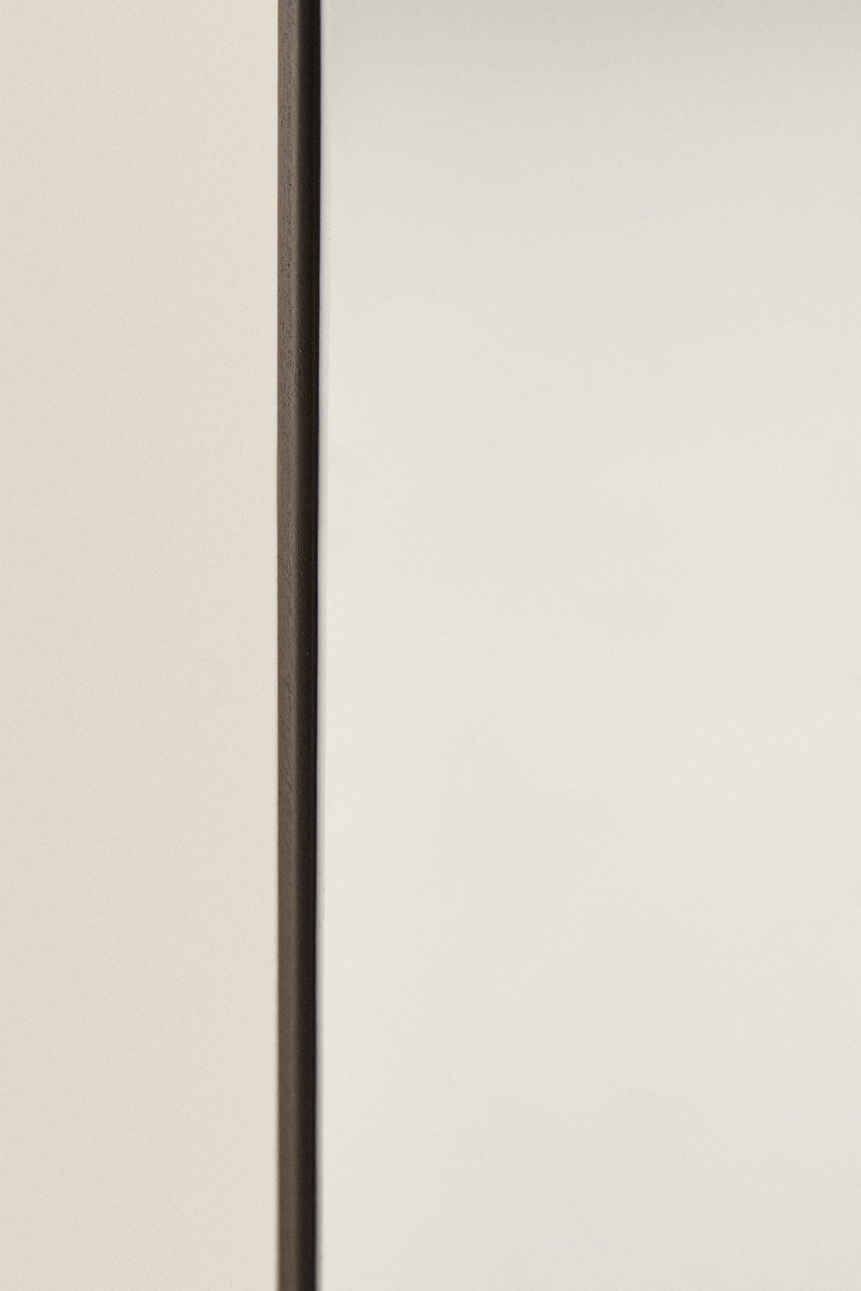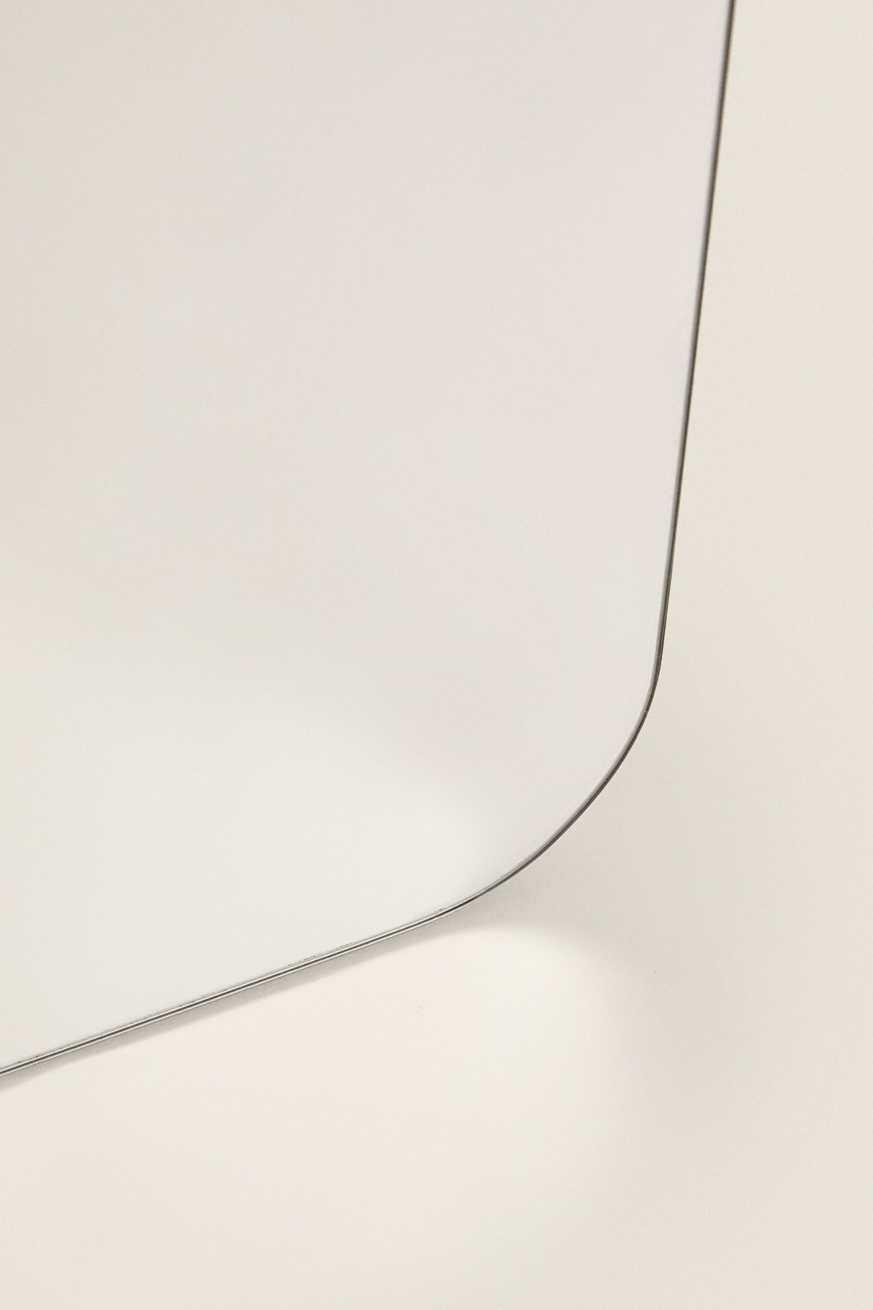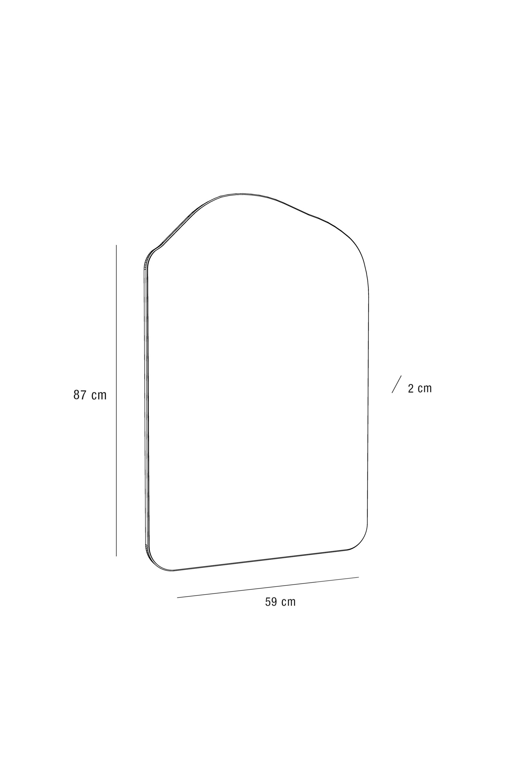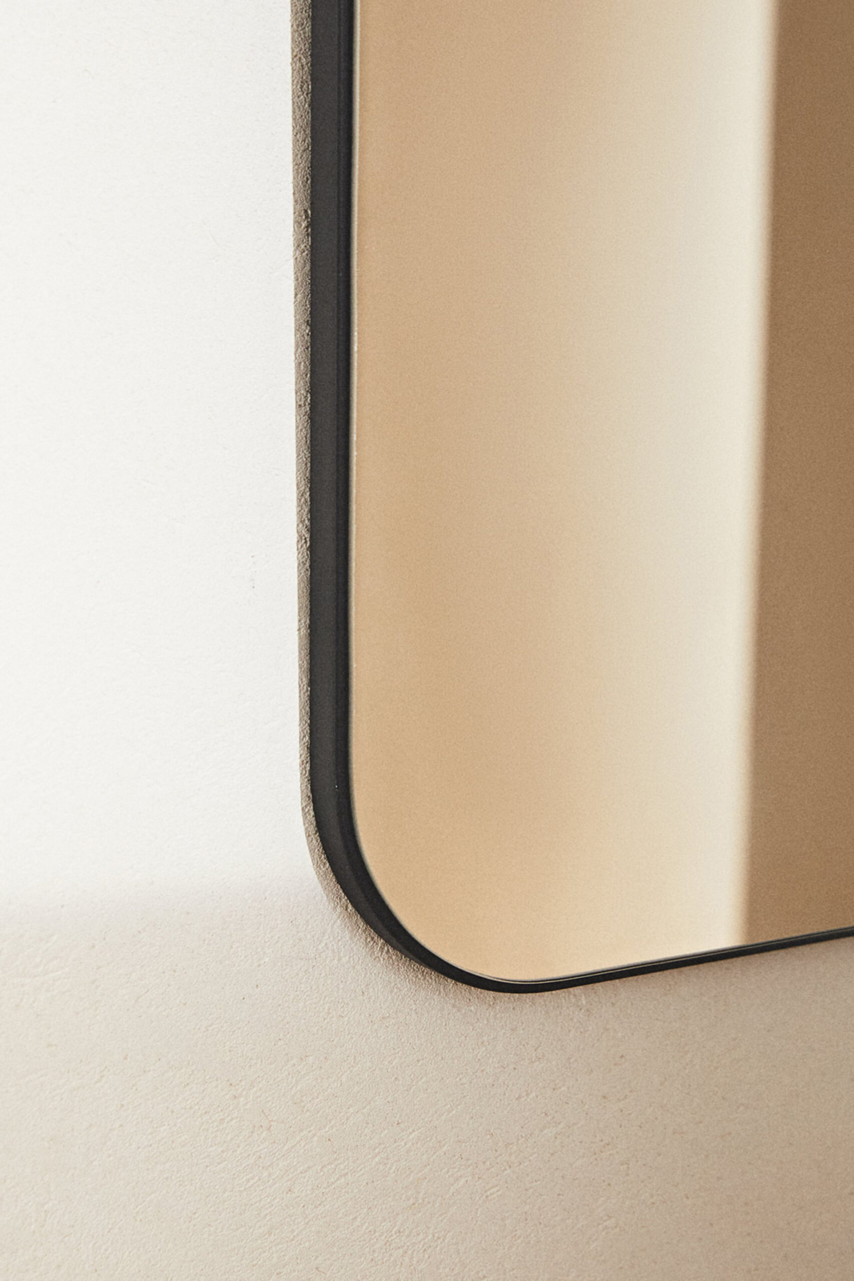 - An irregular-shaped wall mirror with a black frame with rounded edges has two anchor points for vertical placement.