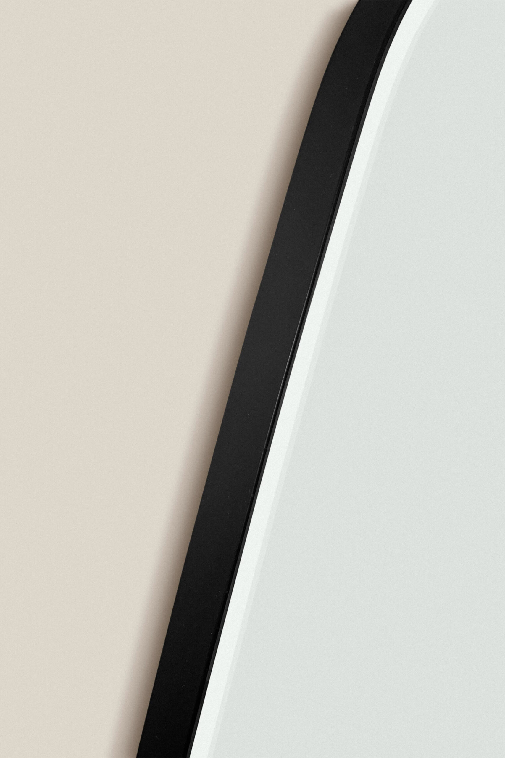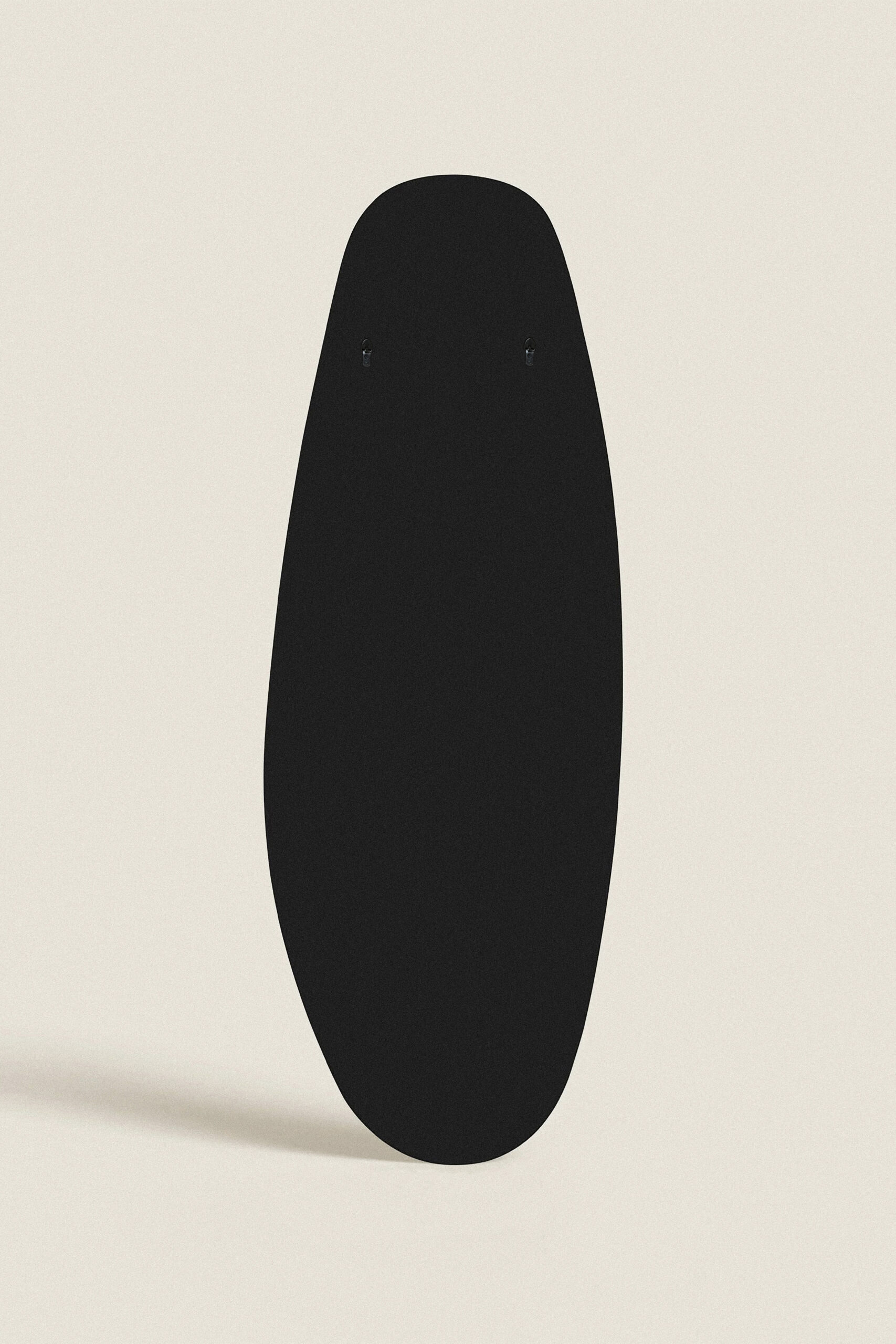 - irregular-shaped wall mirror with a black frame. Features two attachment points for vertical placement.