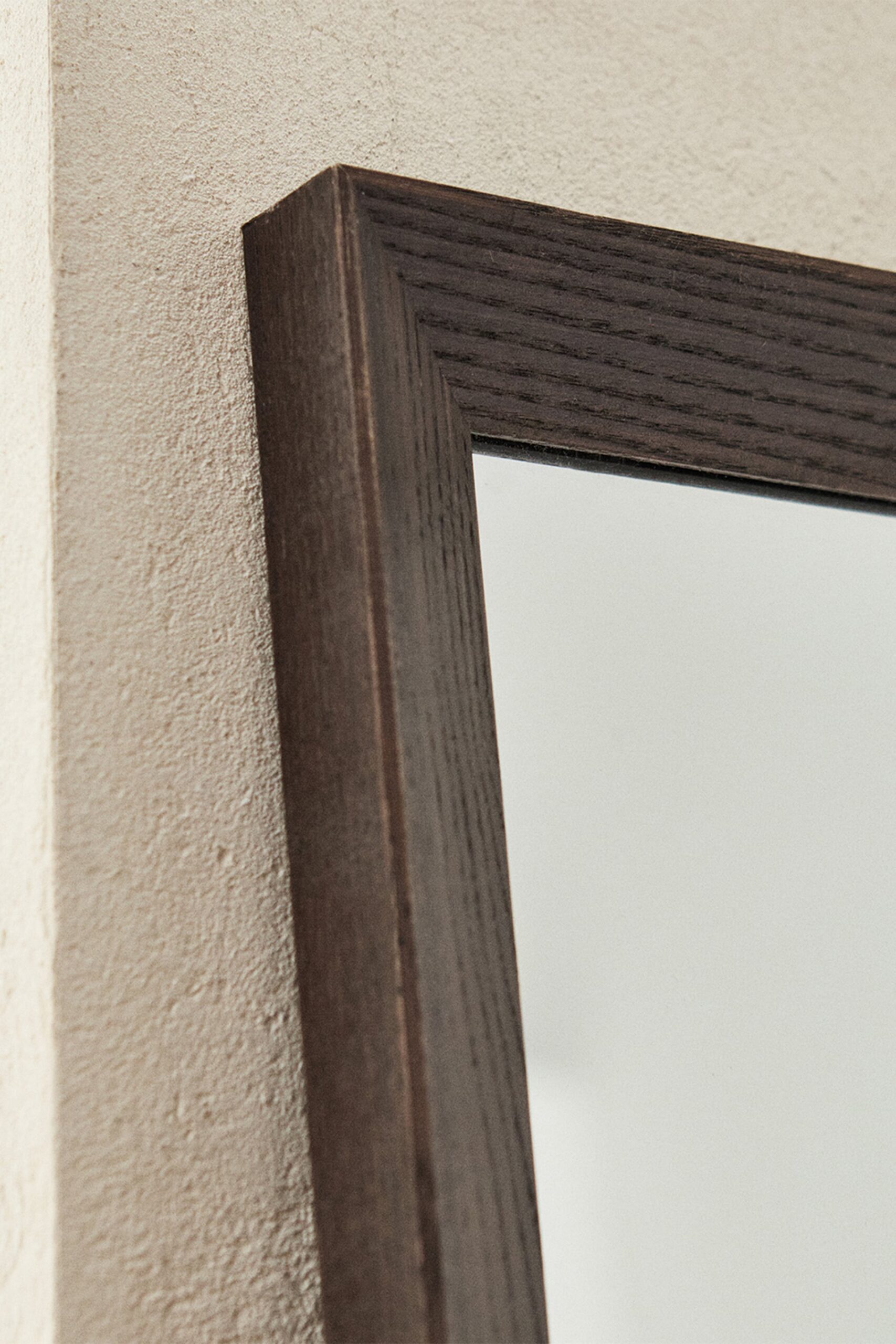 - Rectangular mirror with natural wood frame. It has two anchor points for placing vertically.