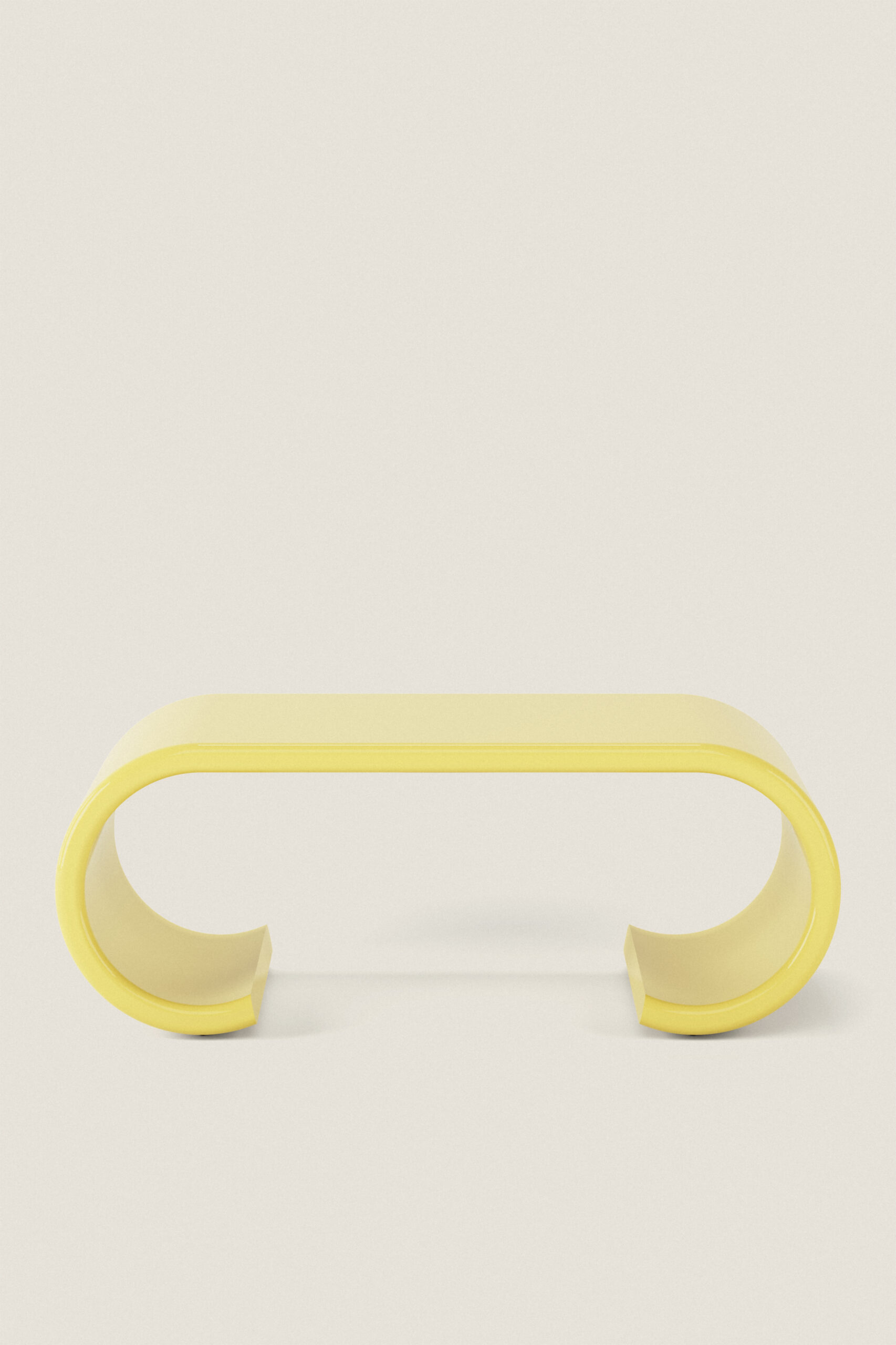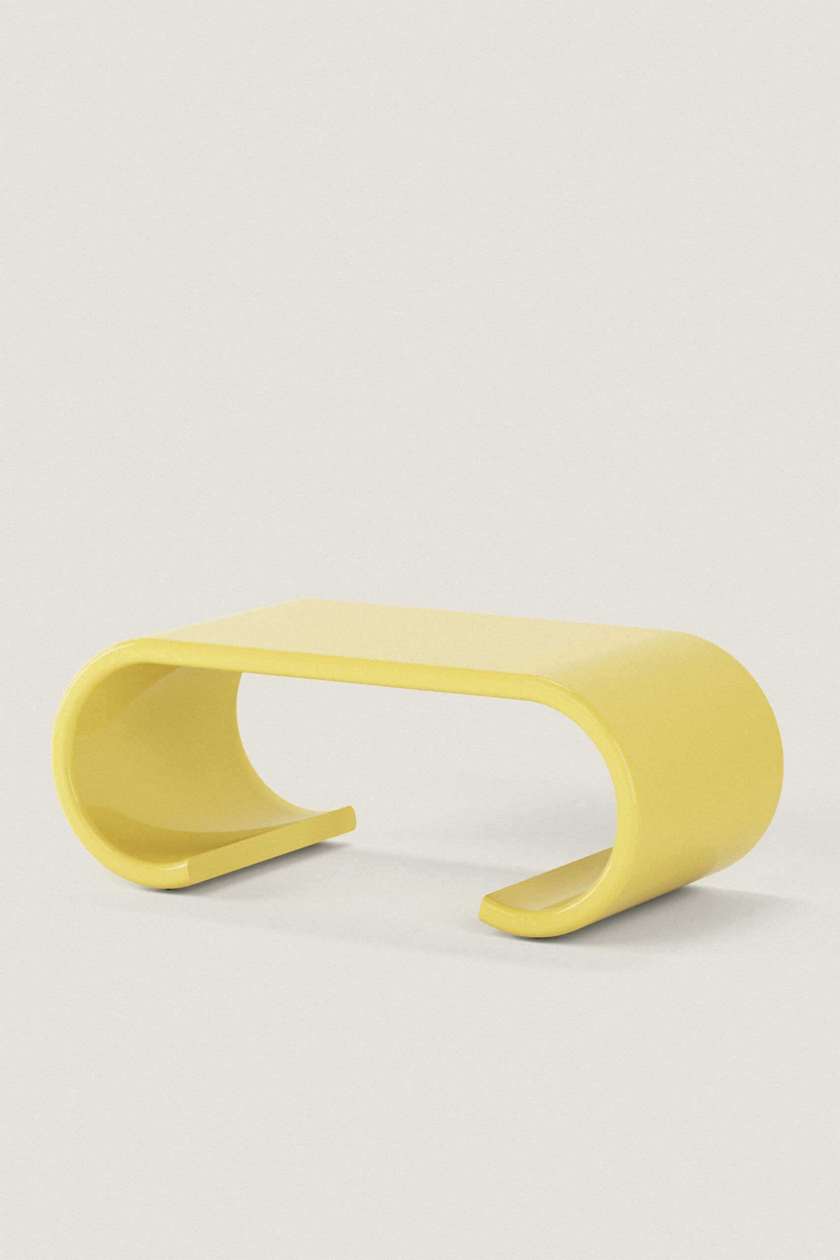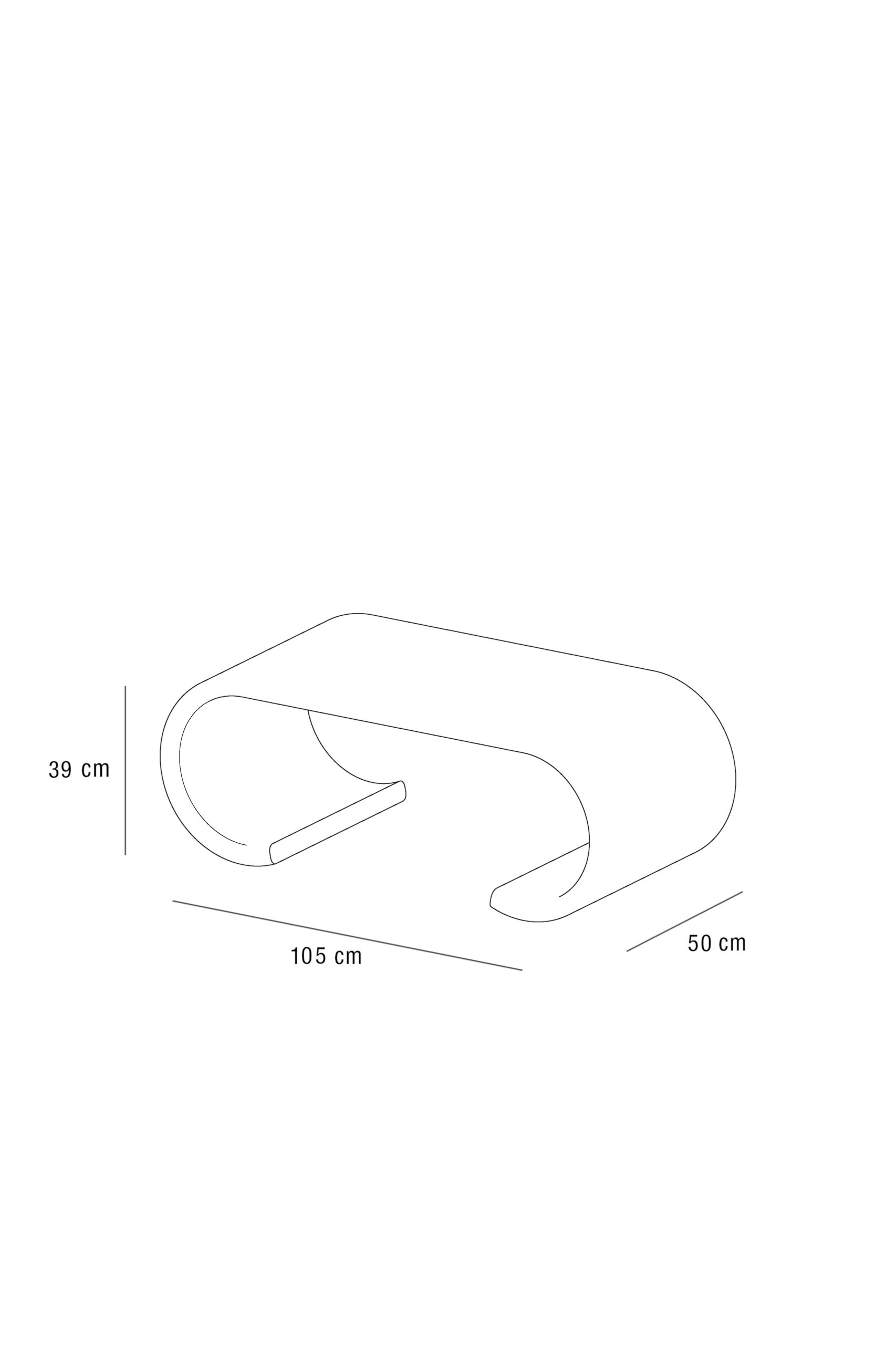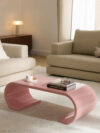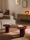 - A coffee table with cylindrical ends, made of natural wood with a high-gloss finish.