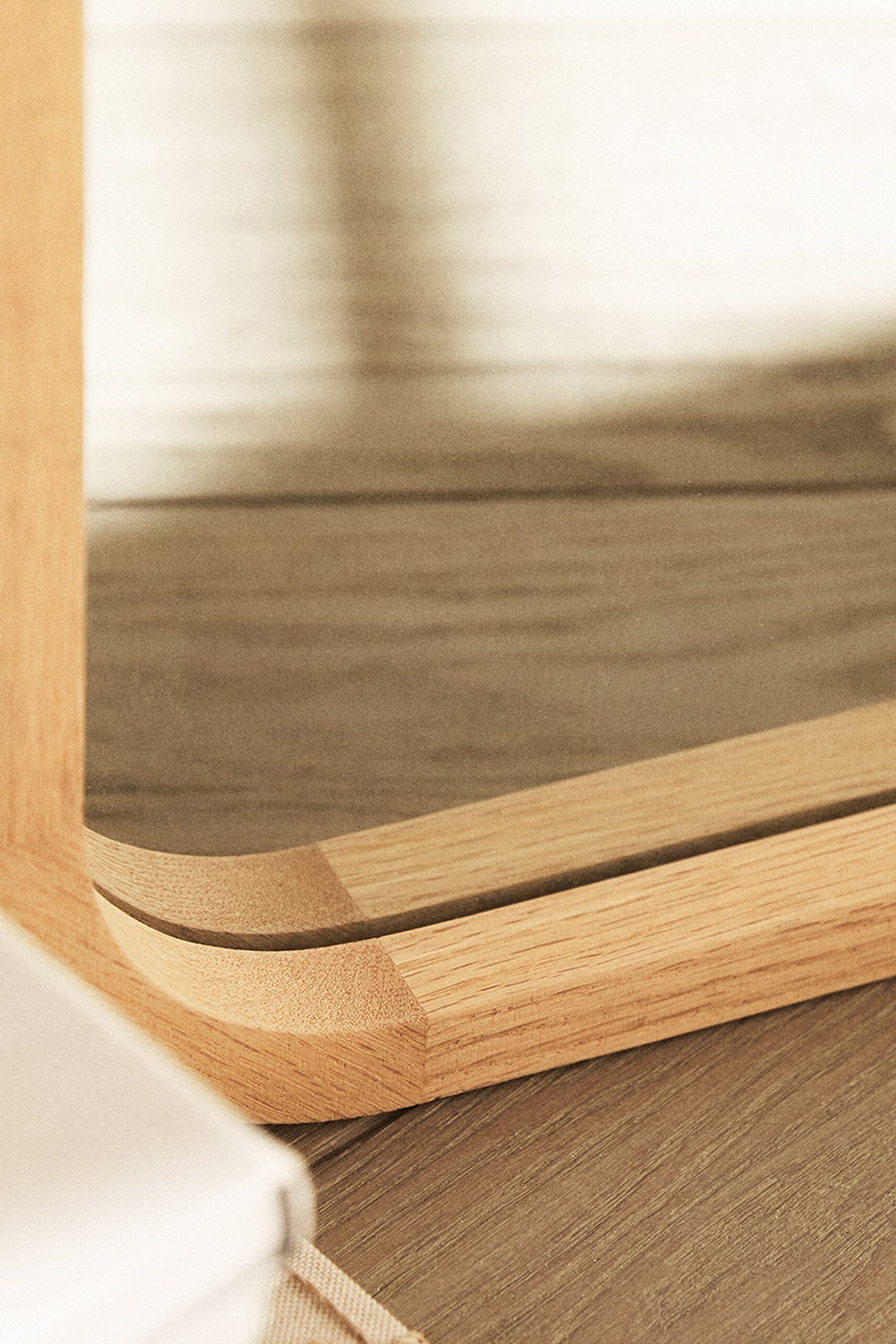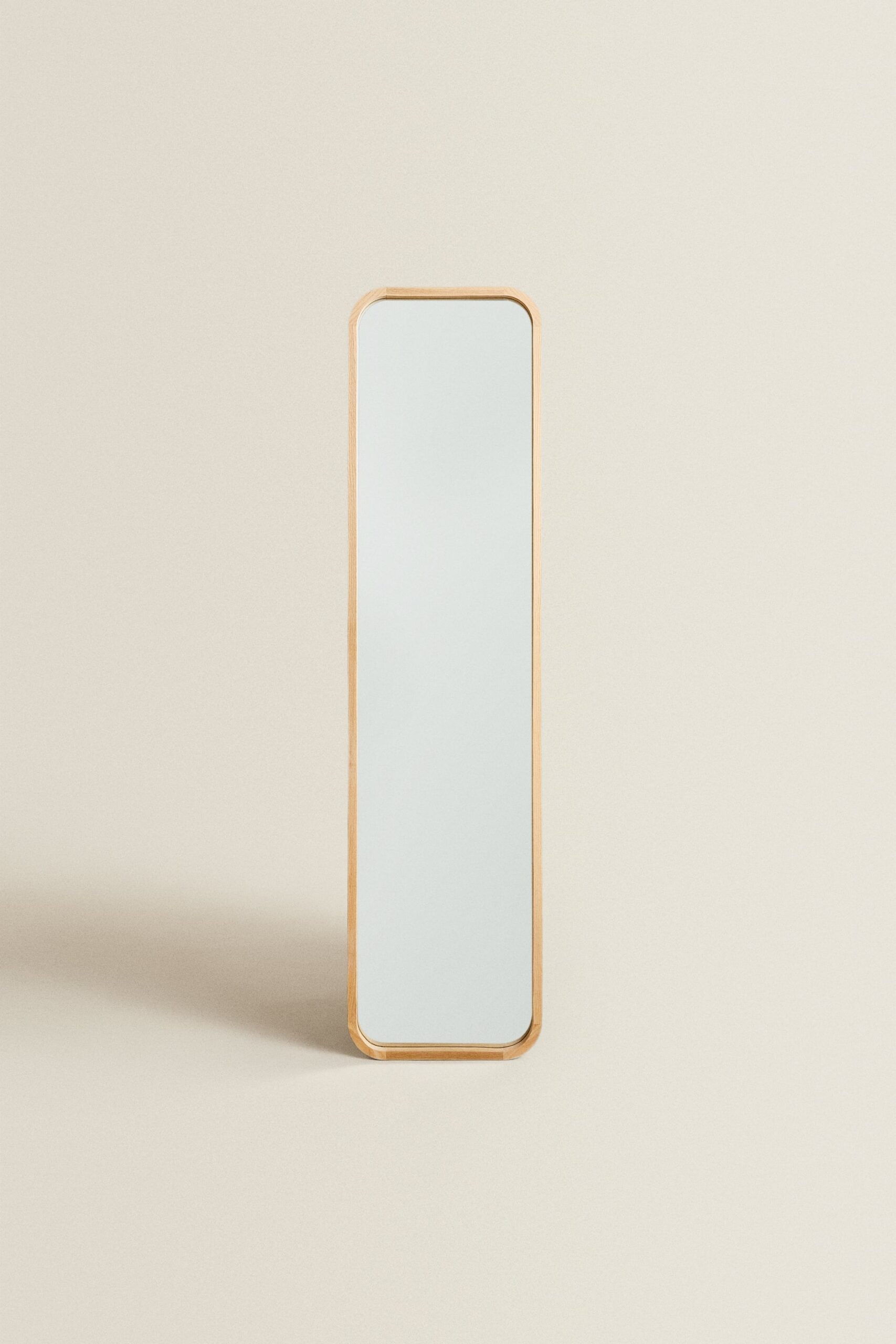 - Rectangular mirrors with an oak wood frame and round edges that can be hung vertically through two fixing points at the back.