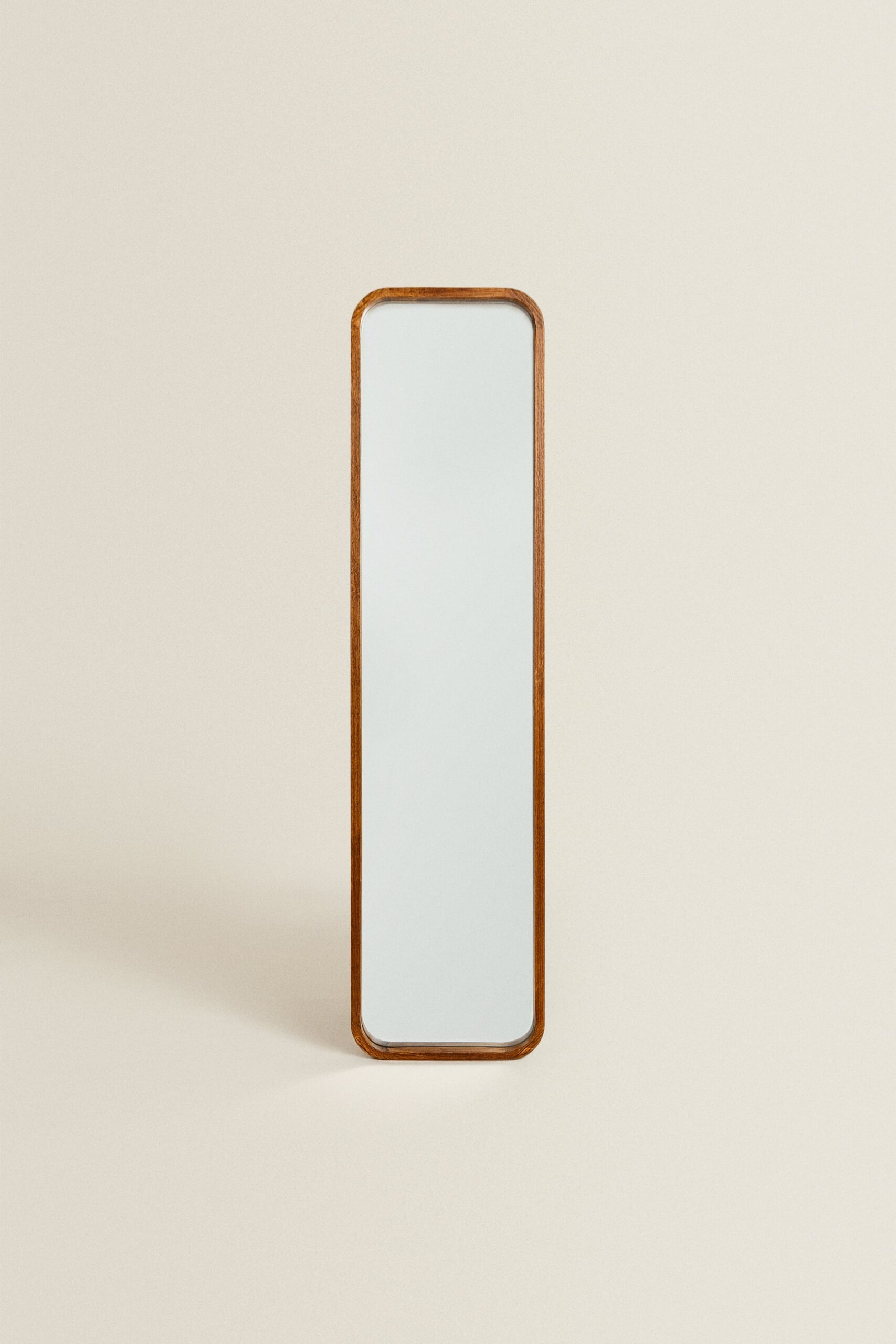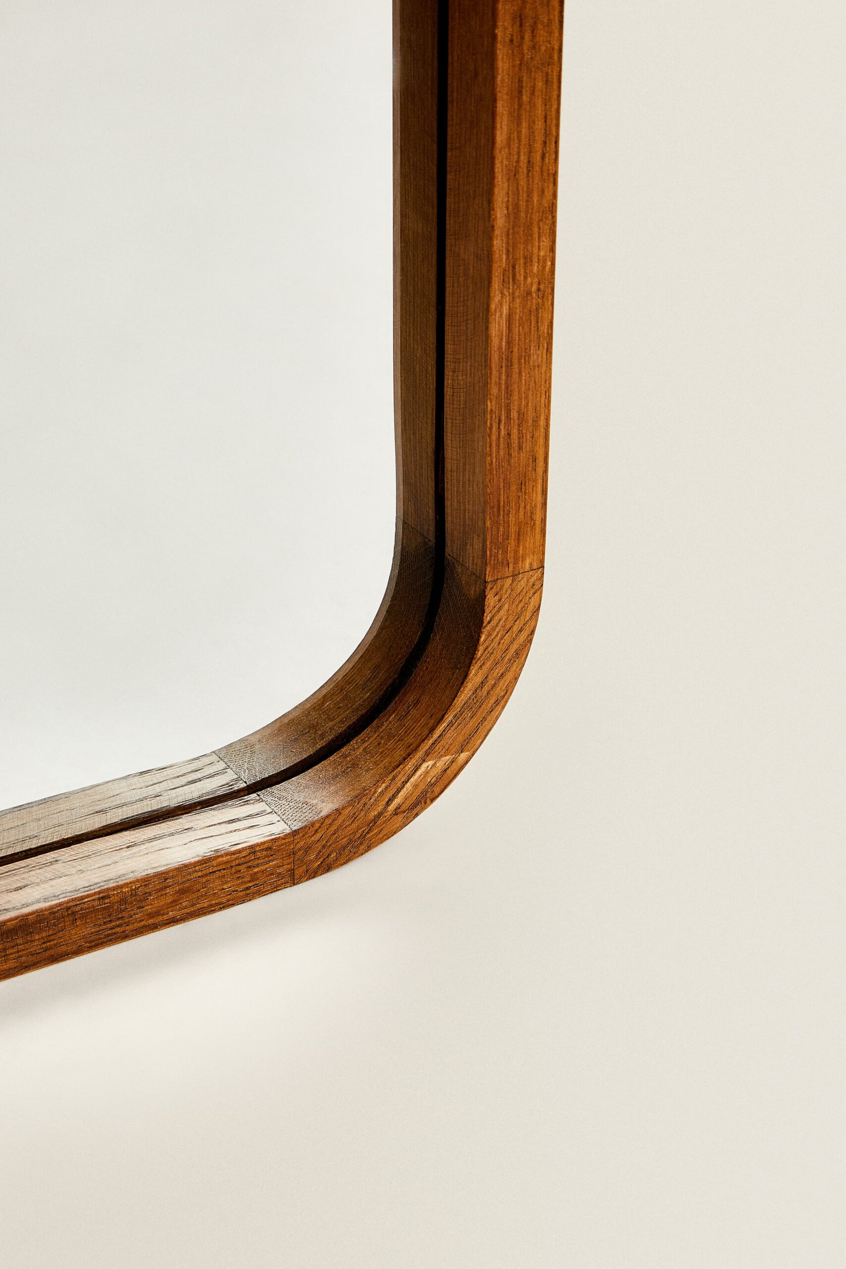 - Rectangular mirrors with an oak wood frame and round edges that can be hung vertically through two fixing points at the back.