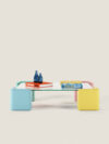 - A coffee table has a playful, modern, and minimalist design. Flat, rectangular, with a clean glass. with smooth, rounded edges.