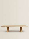 Oak wood coffee table, table is characterized by a rustic finish, crafted from natural wood, both for the tabletop and the legs.